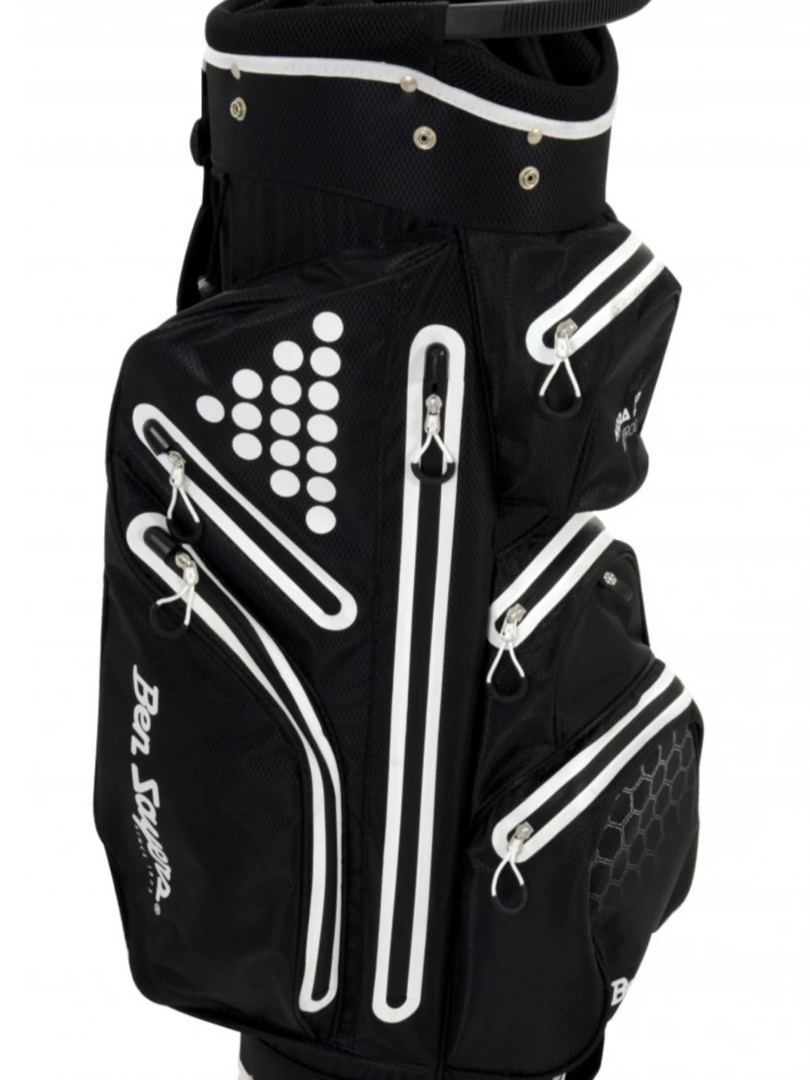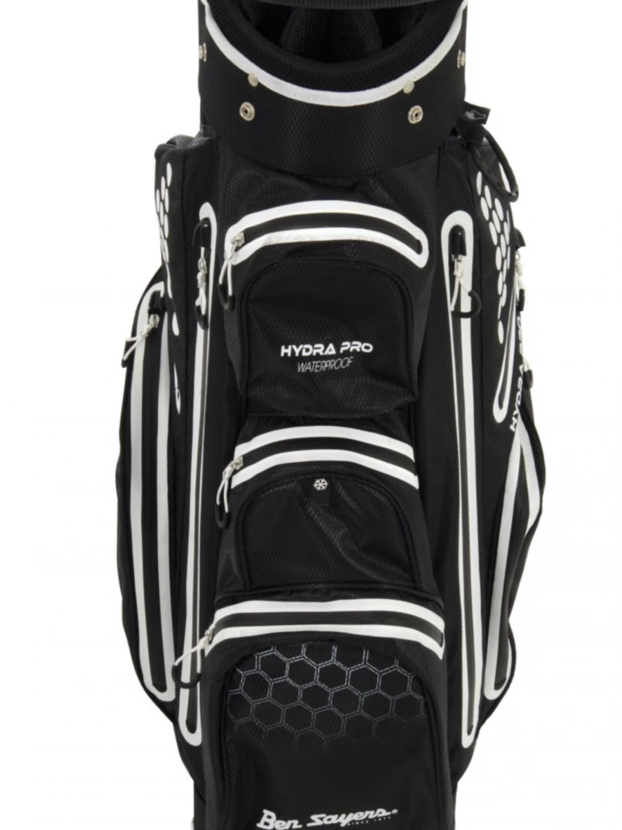 The Ben Sayers Hydra Pro Waterproof Cart Bag features an 8.5” top cuff with a 14-way, graphite-friendly divider system.