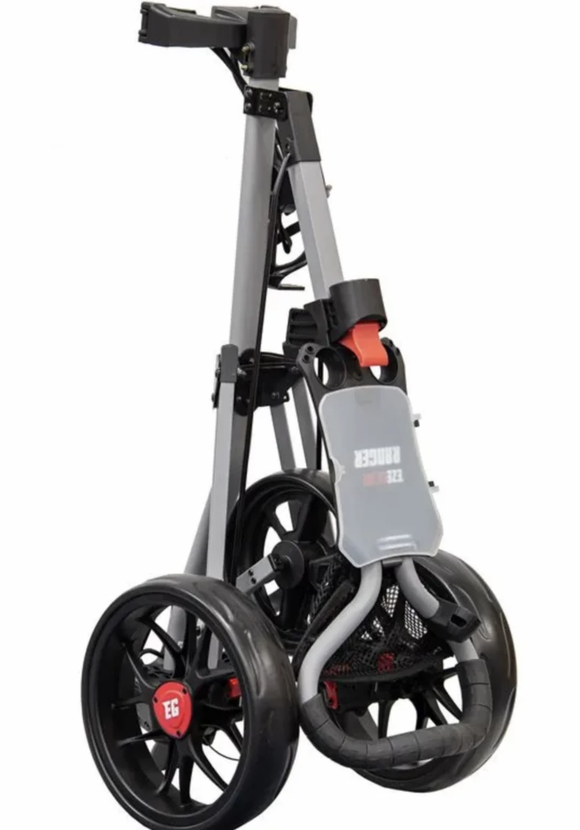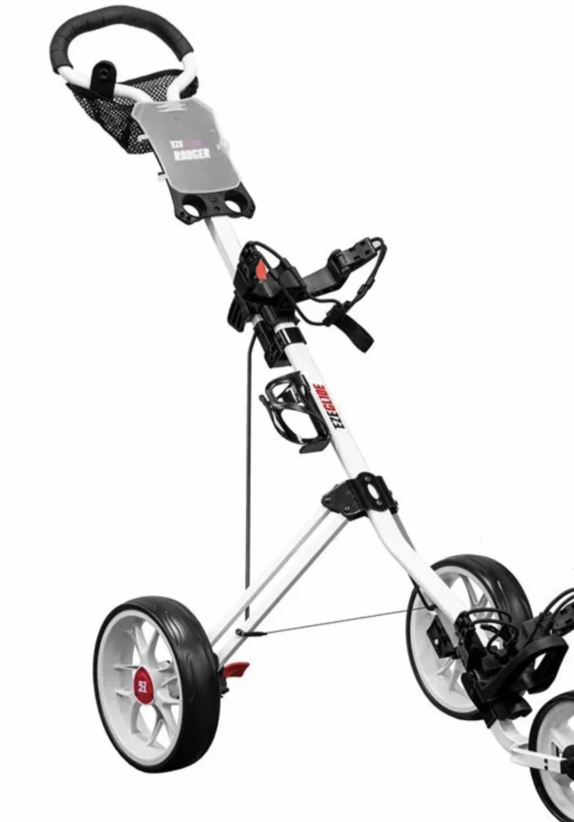 EzeGlide Ranger 3 wheel trolley is great value 3 wheel trolley with a range of features and a lightweight sturdy frame construction. A quick-fold mechanism enables the trolley to be folded flat in seconds. Includes scorecard holder with ball storage space , a mesh storage compartment for other accessories and drinks holder is included. Elasticated Bag Strap On The Top And Bottom. Wide wheelbase ensures optimum stability and easy manoeuvrability. Quick-release side wheels for ease of storage. Some Other features include a click on, click off footbrake.