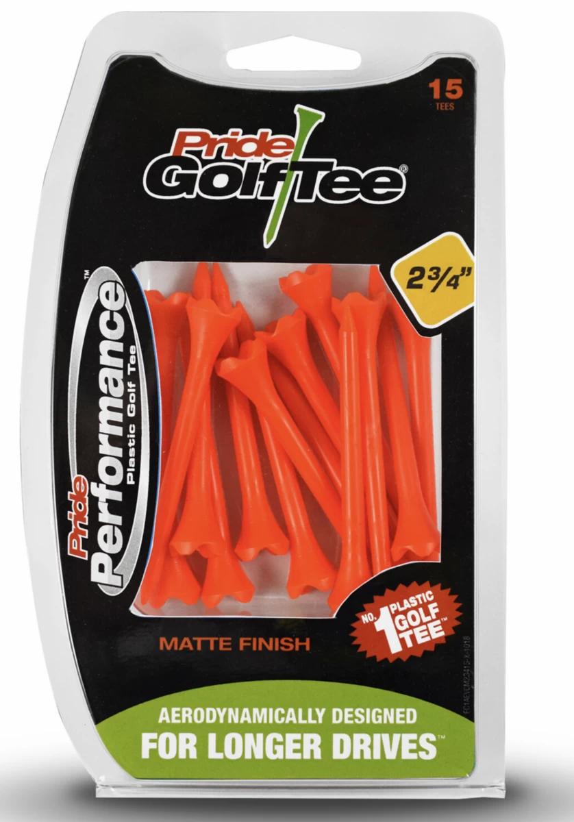 Pride Performance Matte Tees are the newest line in the Pride Golf Tee family. This member of the Pride Golf Tee family is an enviro-friendly, plastic performance tee available in four bright colours: Green, Red, Orange and Blue. Pride Performance Tees are engineered with special low-resistance heads that create less friction between the golf ball and tee resulting in longer drives.