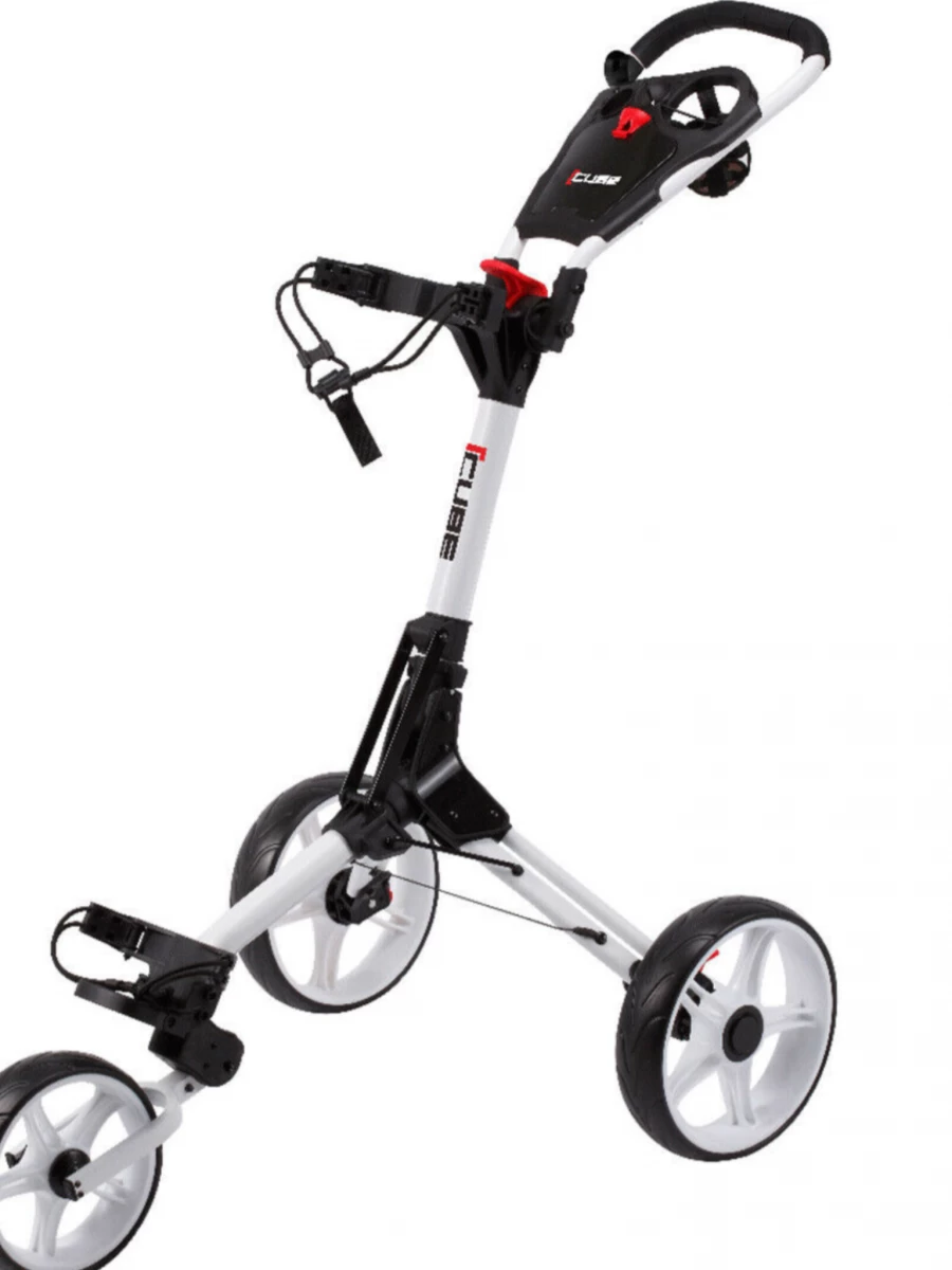 New & Improved for 2021 the Cube 3 golf trolley is the smallest folding 3 wheeled golf trolley on the market Measuring in at an impressive folded 44cm x 37cm x 49 cm, It’s also one of the lightest on the market at just 6.6KG. Packed with features such as an oversized handle with built in storage compartment and drinks holder the Cube 3 also features a handy foot brake so that you can secure it on hilly terrains. The patented one click folding mechanism also makes the Cube 3 golf trolley one of the quickest and easiest golf trolleys to fold and unfold during use.